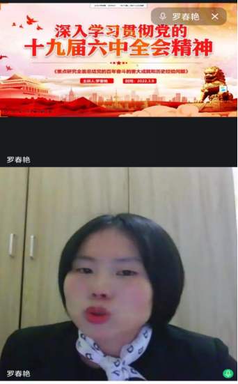 在支部书记讲党课环节,罗春艳老师带领全体党员同志深入学习贯彻党的十九届六中全会精神。罗老师从学习解读全会概述,八个数字带你学习全会公报,百年奋斗的历史意义和历史经验,党的百年奋斗历程,十八大以来党和国家事业取得的历史性成就等五个方面进行了领学,重点解读了党的百年奋斗的重大成就和历史经验。