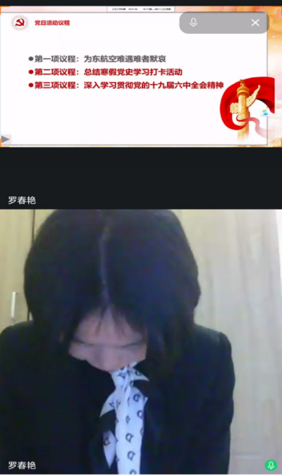 会议开始,支部书记罗春艳老师介绍了本次党日活动的三项议程,分别是:为东航空遇难者默哀,总结寒假党史学习打卡活动,重点进一步深入学习贯彻党的十九届六中全会精神。