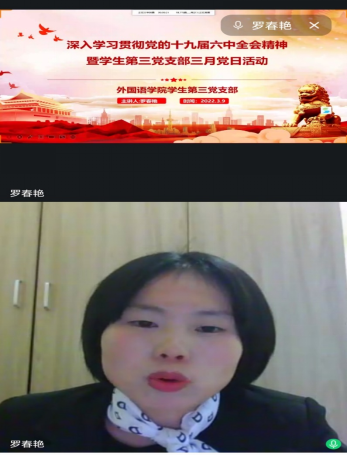 为了进一步加强学习贯彻党的十九届六中全会精神,巩固拓展党史学习教育成效,切实提高组织生活质量。3月30日19时,基于疫情防控的需要,外国语学院学生第三党支部通过线上会议的方式,开展了以“深入学习贯彻党的十九届六中全会精神”为主题的党日活动。