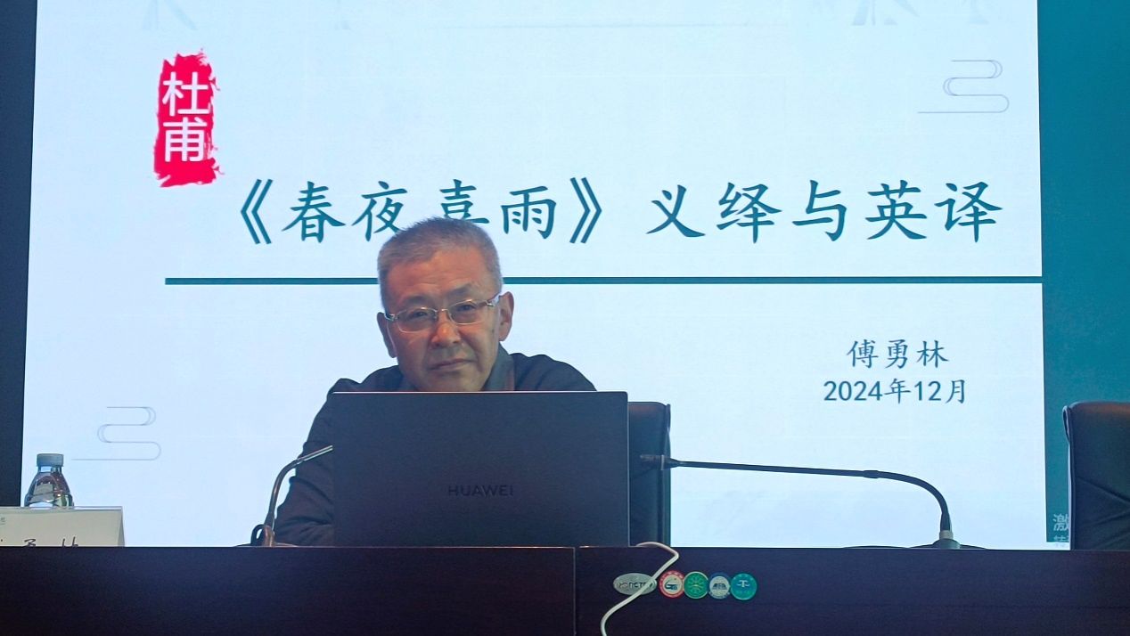 傅勇林教授从杜甫名篇《春夜喜雨》的义绎与英译切入,先对全诗深入义绎,点出该诗用字精妙之处与结构严谨之美。再以关于《春夜喜雨》的历代诗评引出诗学八原则和品诗必备之要素,指出文学批评和鉴赏是与个体生命体验对话,品鉴者需将知识内化为个人的学养与修养,方可实现从文字的辞典义抵达文本义,进而上升至理论义与诗意。随后,傅勇林教授以许渊冲、翁显良等翻译名家对此诗的英译为范本,指出对中文原作的深入义绎是成功英译的必要前提。傅勇林教授强调,强化语言基础训练是进行跨语际实践的基础。