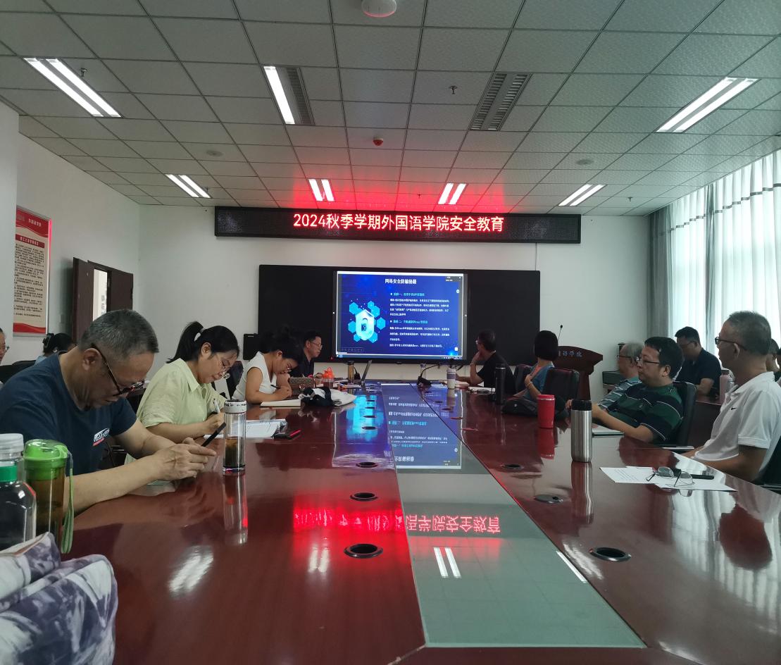 9月12日下午,外国语学院在知行楼532召开学院2024年秋季学期意识形态与安全稳定工作专题会。学院领导班子成员与全院教职工参加会议,会议由学院党委书记文小兵主持。