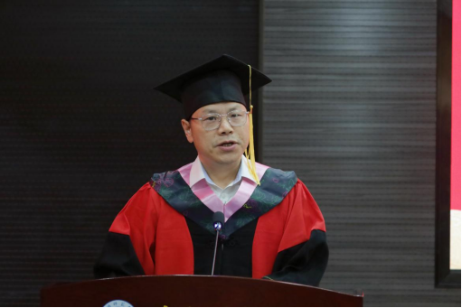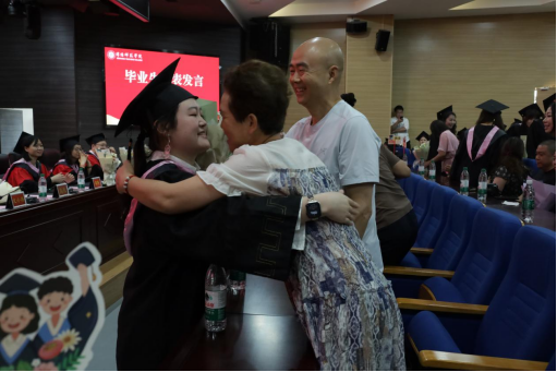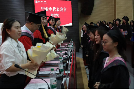 情牵·暖青春。师者的话语,是最温暖的行囊。教师代表骆海辉教授用"课堂卷王""配音达人""实习导师"等鲜活标签,勾勒出毕业生们立体生动的青春群像;"奋斗是人生的马拉松,自律是每日的听写作业"的金句,既有师者的智慧,更有朋友的贴心。辅导员余明友则用"1417个日夜"的时光刻度,讲述了疫情期间接站、深夜送医、牵挂海外实习学生等动人细节,一句“社会容错率几乎为零,切不可任性”的恳切叮嘱,让现场不少毕业生红了眼眶。