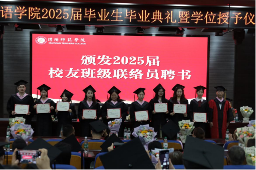 启航·向未来。校友班级联络员是连接校友与母校的桥梁。高见宣读《2025届校友班级联络员聘任决定》,并为联络员们逐一颁发聘书。骆海辉、刘静静、王润稷为毕业生赠送专属毕业纪念品后,典礼进入激动人心的学位授予环节。苟萍宣读学位授予决定,学位评定委员会成员为毕业生逐一拨穗授位。当帽穗从右至左轻轻拨正,这一象征学术传承与责任交接的仪式,将典礼推向高潮。最后,学弟学妹们献唱《明天,你好》,用歌声传递祝福,现场洋溢着“愿此去前程似锦,再相逢依旧如故”的温情。