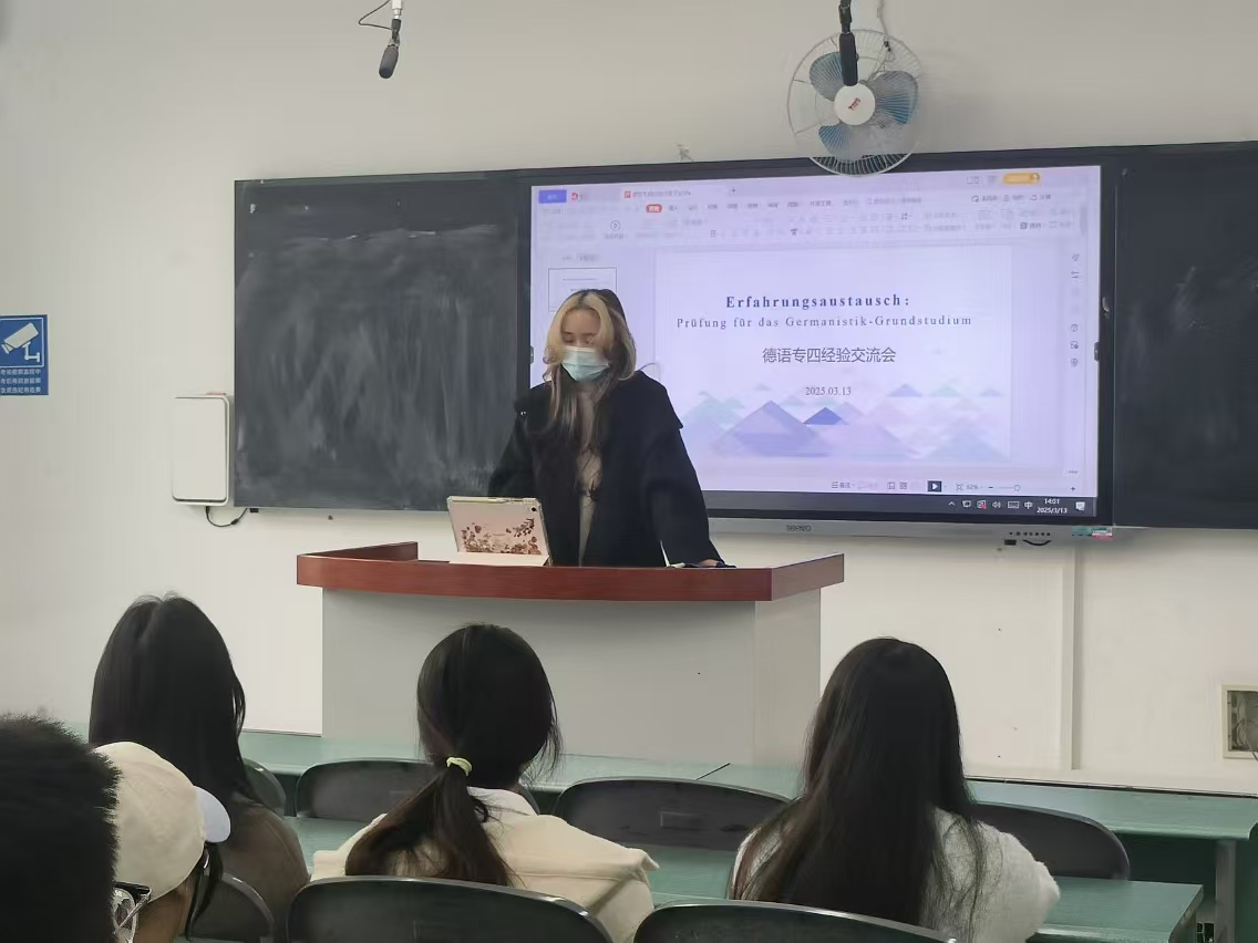 为帮助德语专业23级学生更好地备战即将到来的专业四级考试,3月13日下午,德语教研室在厚德楼202举行德语专业四级考试经验交流会,德语专业23级学生以及22级优秀学生代表参加,活动由德语专业教师刘静静主持。