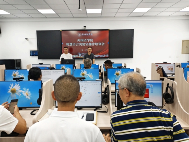 为推动教育数字化转型,提升外语教学创新能力,副院长高见介绍了智慧语言实验室的建设情况,并强调了安全使用规范:“智慧语言实验室是‘外语教学创新的重要引擎’,既要充分发挥设备优势,也要坚守安全底线,全体教师必须严格遵守操作流程和管理制度。”随后,技术人员通过“理论讲解+实操演示”方式,为教职工开展专项操作培训。