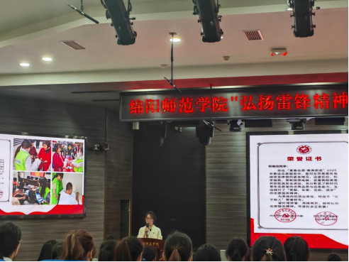 观身边雷锋,传志愿精神。22级学生苟雨欣现场分享了她2025春运“青春志愿,情满旅途”服务中的英勇表现,她的事迹受到巴中日报专题报道,其本人也被中共巴中市委社会工作部、巴中市志愿者协会授予“乐于助人”荣誉称号。她的实际行动生动诠释了“奉献、友爱、互助、进步”的志愿服务精神,激励在场的每一位同学。