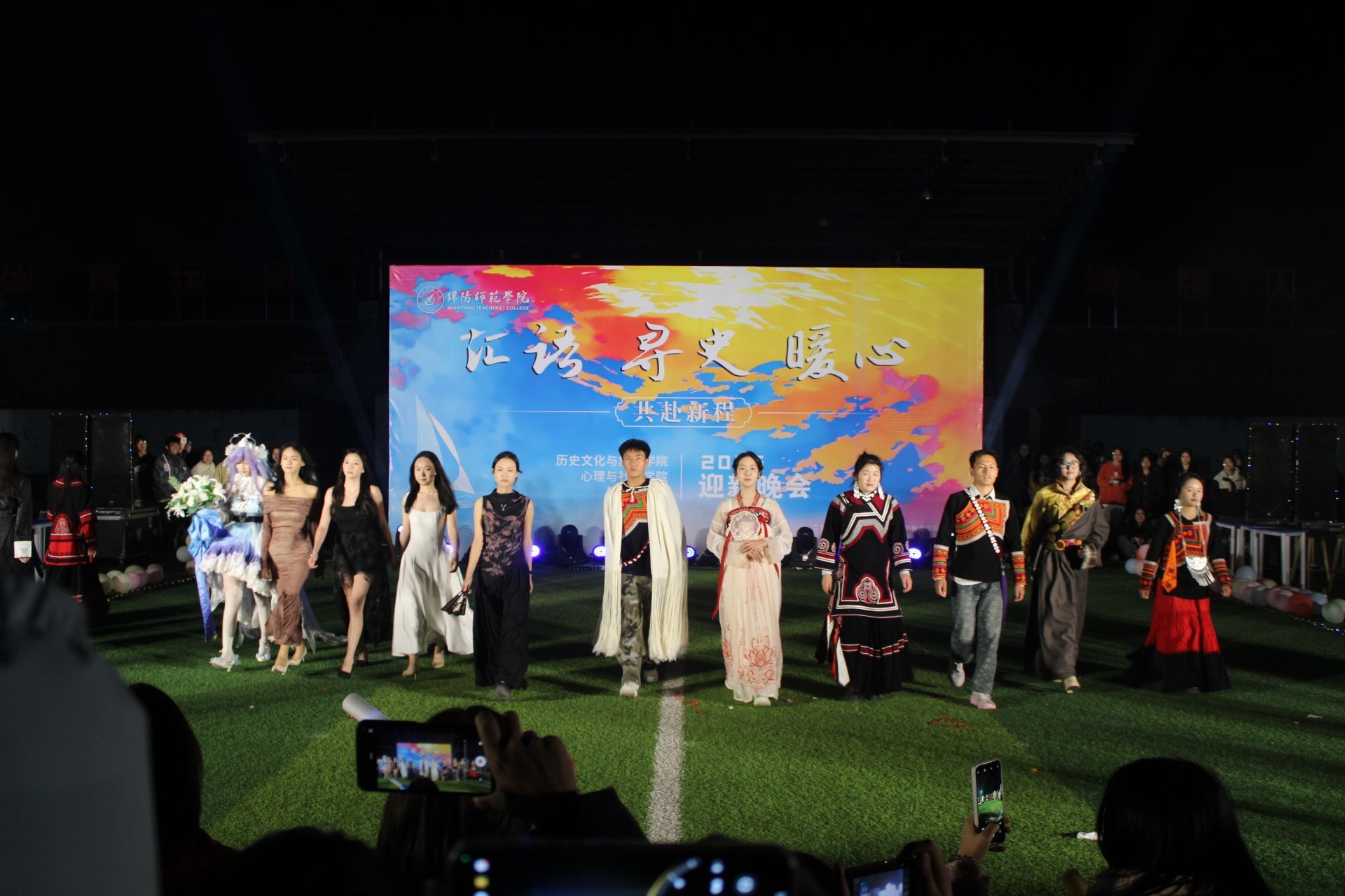 尾声,三个学院班子成员、专兼职辅导员合唱《明天会更好》,温柔的歌声中满含对学生的祝福与期许。曲终掌声雷动,晚会圆满落幕。此次三院联袂举行的迎新晚会,不仅是一场视听盛宴,更是一堂淬炼初心的“启蒙课”:史为基、语为帆、心为暖,育人底色鲜明。愿2025年新加入绵师的同学们以晚会为序章,以青春赴初心,在绵师淬炼本领,在强国建设、民族复兴的征程中书写青春答卷。