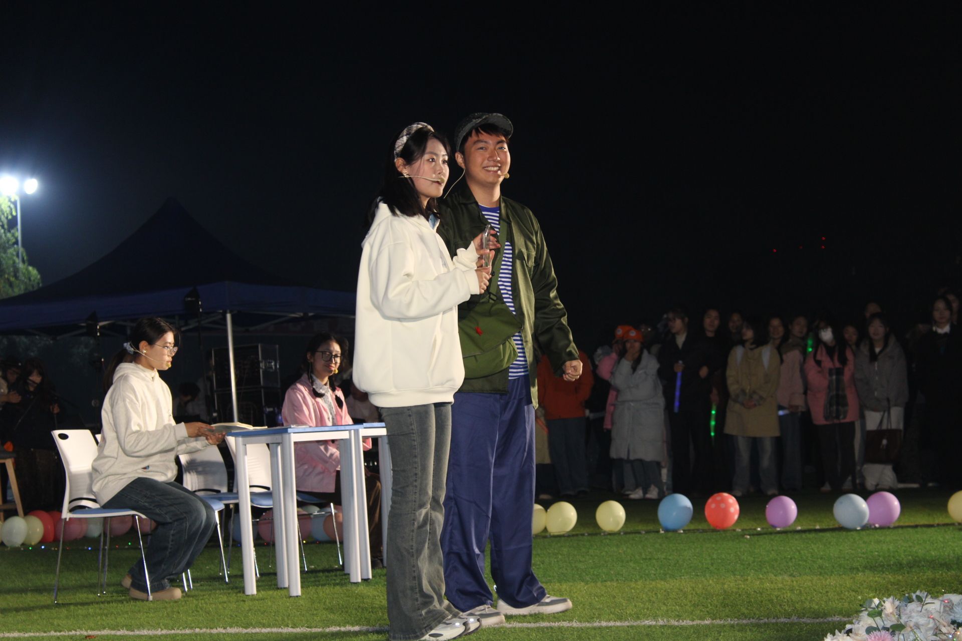心理与社会学院合唱《像晴天像雨天》,清甜声线勾勒青春轮廓,新生轻声跟和,感受青春里的阴晴与共;外国语学院小品《跨时空的共鸣》以跨越时空对话彰显青春昂扬,诙谐桥段引发现场欢笑。“猜歌名”互动点燃全场,一名新生秒速抢答获喝彩。随后,《想你时风起》独唱深情动人,沉浸式感受青春里的细腻思念;《起舞》舞蹈灵动吸睛,旋转跳跃间彰显青春活力。首轮抽奖送出定制围巾,三院各4名同学获奖,为现场添暖。