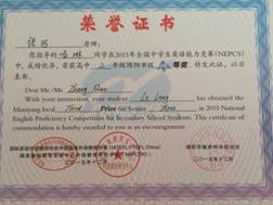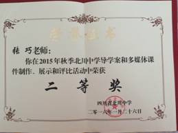 张巧,中共党员,2013年6月毕业后,受聘于北川中学。2014年6月,参加绵阳市首届“文轩教育杯”微课大赛,获得高中英语学科“二等奖”;2015年暑期参加北川中学教师技能大赛获“一等奖”;2015年12月,指导的学生李琳参加全国中小学生英语能力竞赛(NEPCS)获高中三年级组“三等奖”;获2015年北川中学导学案和多媒体制作展示评比活动“二等奖”;2016年6月,获北川县“优秀共产党员”荣誉称号。